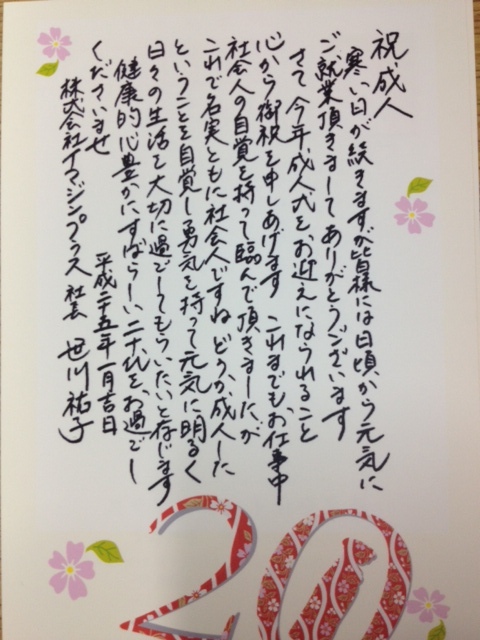 私どものスタッフさんにも、今日、成人の日を迎えられる方がたくさんいらっしゃいます。